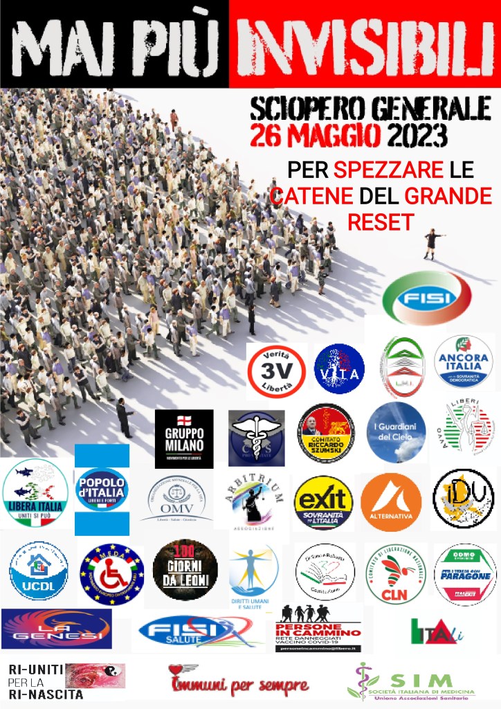 “FISI: 26 maggio 2023 , sciopero generale. Contro il Piano nazionale di vaccinazione ed il green pass base, per il reintegro dei radiati e sospesi dal servizio per inottemperanza agli obblighi vaccinali, per la certezza di cura e di assistenza gratuita a tutti i danneggiati da vaccino e per lo stop alle armi.”
